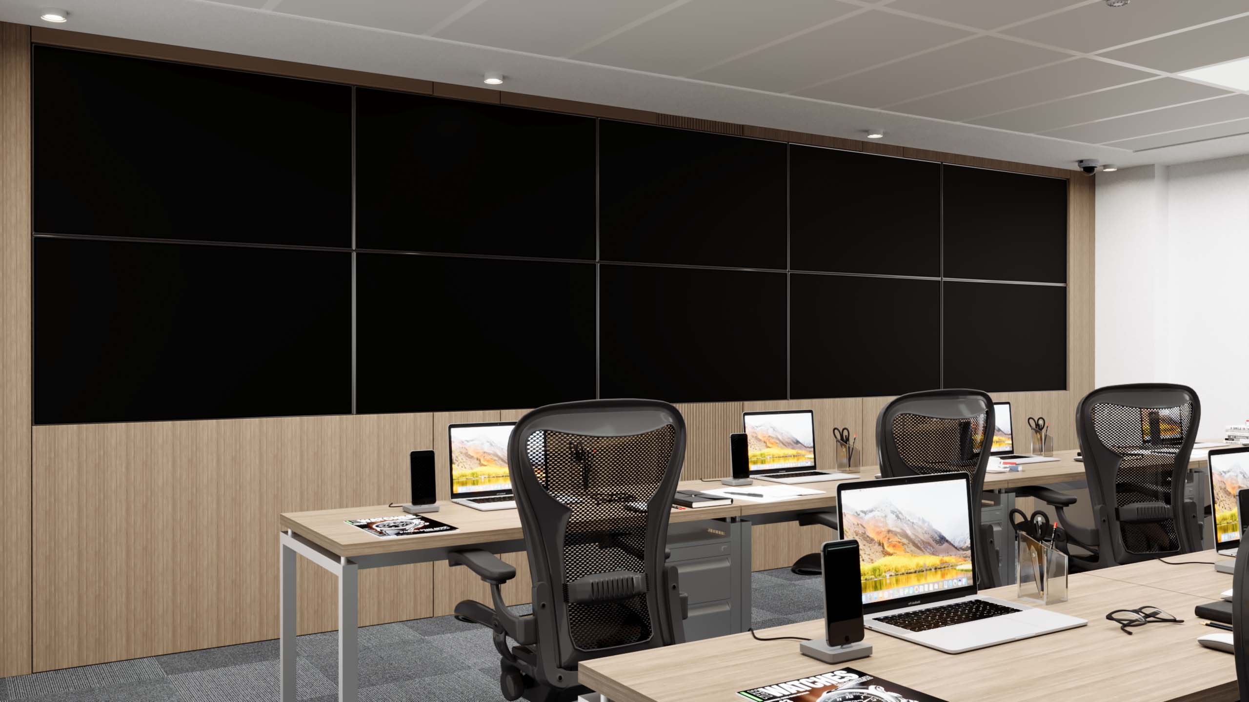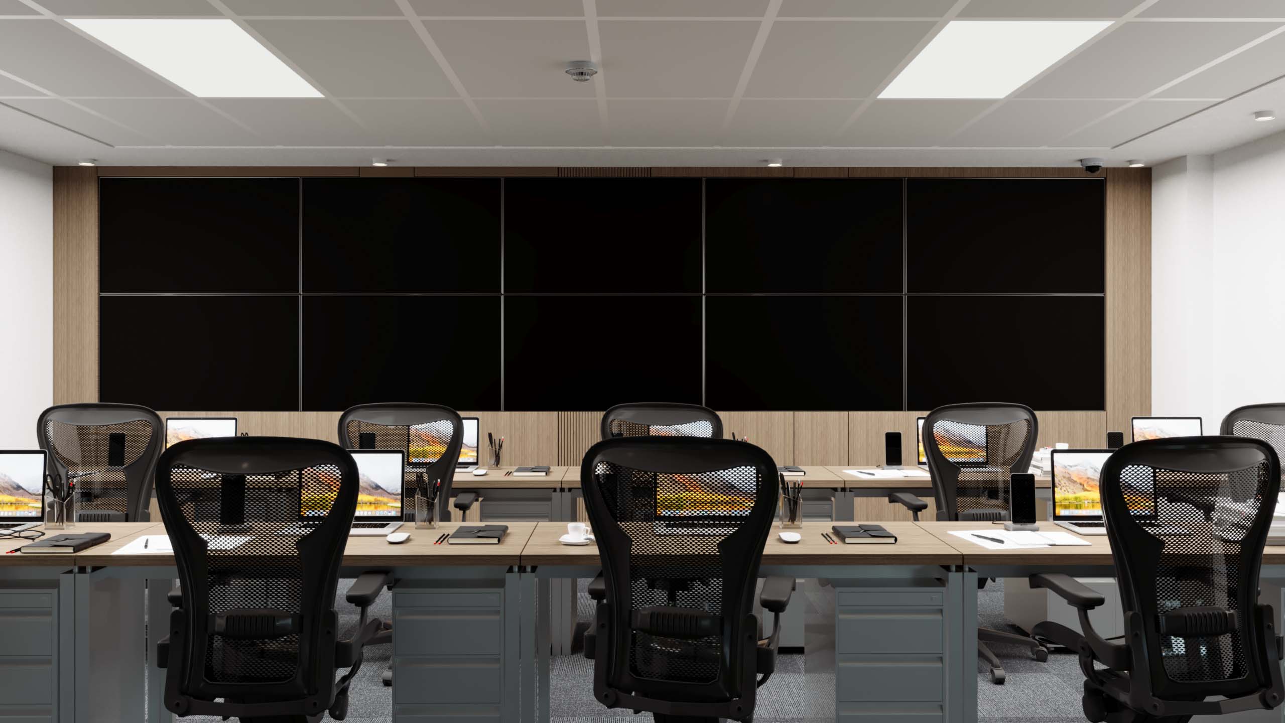 The e&enterprise Media Room project showcases our expertise in delivering top-tier interior design and fit-out solutions. The combination of a functional workstation with a black chair, a media wall with wooden cladding, a sophisticated black-grey mix carpet, and a fully automated room creates an innovative and inviting space.